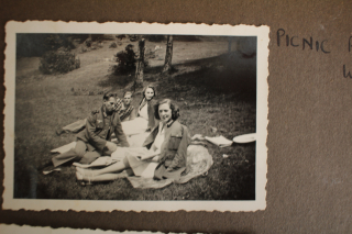 The caption to the photo below reads: Picnic by the Lautersee with Wolffe and Hans. A little research tells me that the lake is about 1000 metres above sea level and above Mittenwald. The girls at the picnic are Molly and Joan and the fact that they have WW2 German army tunics over their shoulders suggests that the altitude is cooling the air more than they anticipated.